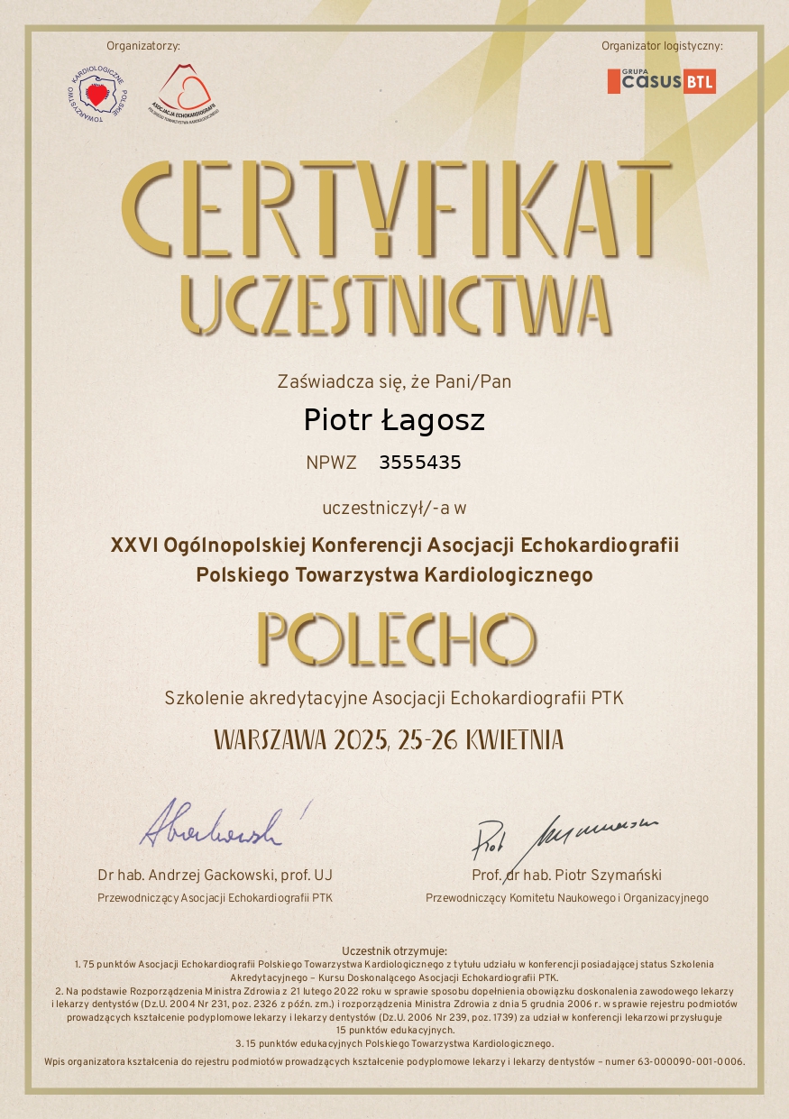 Piotr Łagosz- absolwent Uniwersytetu Medycznego im. Piastów Śląskich we Wrocławiu. Doświadczenie zawodowe zdobywał w Instytucie Chorób Serca Uniwersyteckiego Szpitala Klinicznego we Wrocławiu, gdzie łączył pracę kliniczną z rozwojem naukowym.